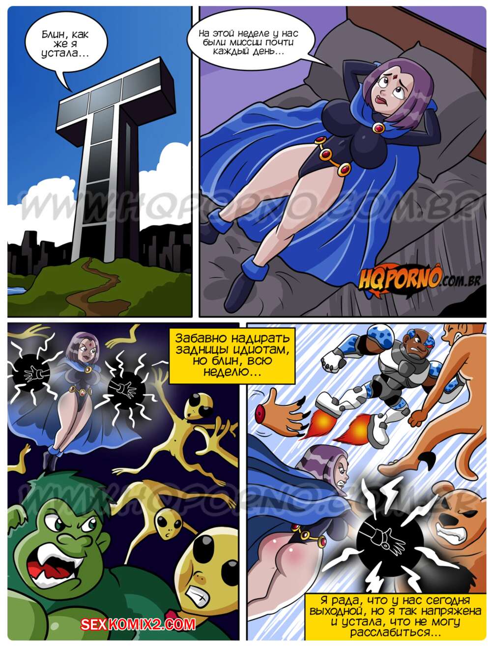 Порно комикс Юные титаны. Часть 5. Jovens Titas. HQporno Рейвен устала после ежедневных миссий каждый день, поэтому ей нужен огромный член, чтобы расслабиться. Красотка соблазнила Парня Зверя и попросила его сделать себя хуй побольше, после чего дала ему себя выебать.